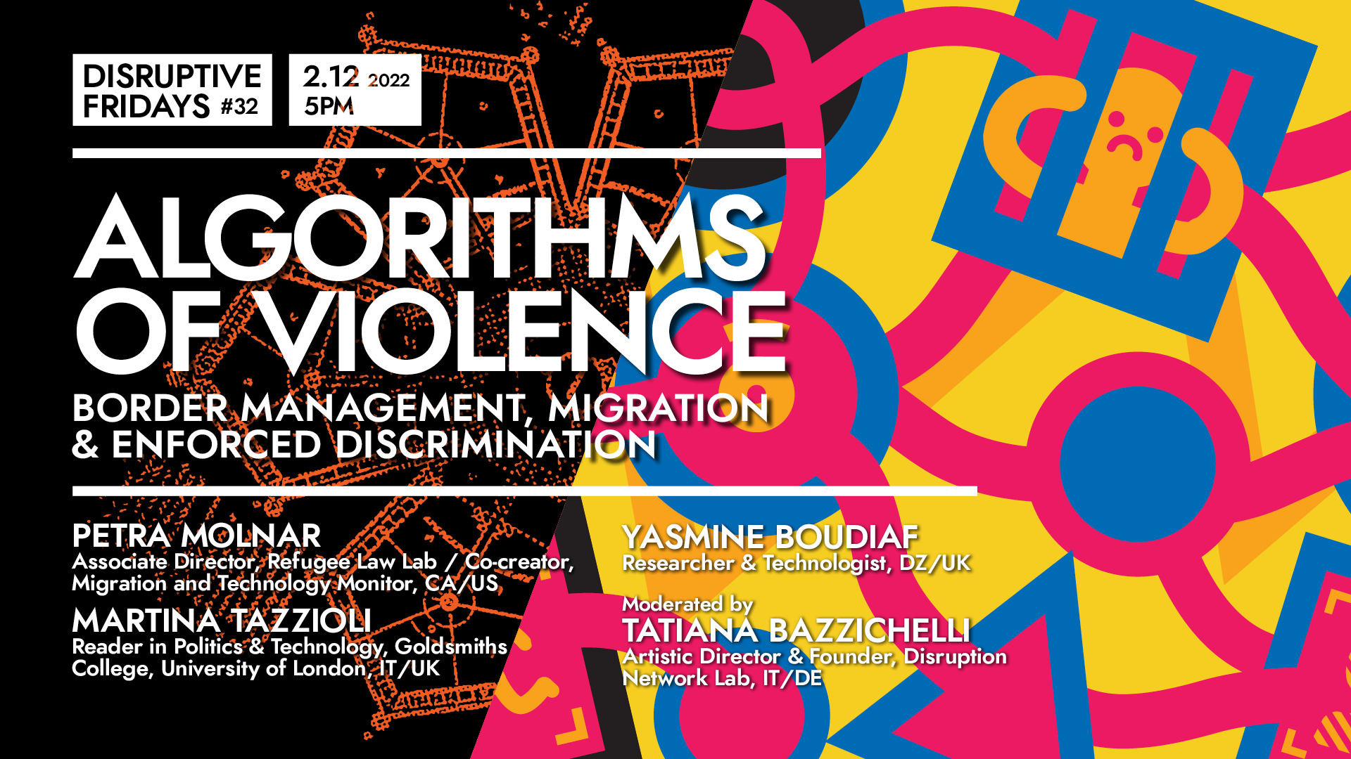 Two online panels of the Disruptive Fridays series. Opening Prisons (November 4, 2022) and Algorithms of Violence (December 2, 2022) discussed prison surveillance, border control, migration tracking and monitoring through artistic practices and ethical implications of emerging technologies.